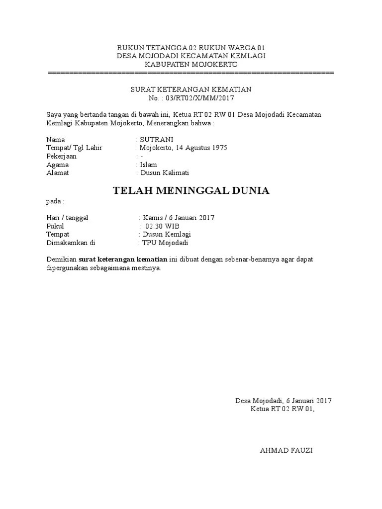 Meminta surat pengantar dari rt dan rw. Berikut ini contoh surat kematian yang benar dari rt, rw, beserta syarat dan cara membuatnya yang telah popbela rangkum. Apalagi anda yang akan mengurus dokumen tersebut dengan pejabat daerah setempat atau rt/rw. Melihat contoh surat kematian yang benar diperlukan bagi kamu yang hendak mengurus dokumen tersebut ke rt/rw, desa, hingga dukcapil . Foto copy ktp 2 orang saksi. Apabila almarhum meninggal di rumah sakit maka dapat meminta surat keterangan dokter. 9****formulir surat keterangan kematian (f2.29) adalah formulir yang diterbitkan oleh desa/kelurahan sebagal formulir keluaran. Apabila kerabat anda meninggal di rumah sakit, maka anda harus menyiapkan surat keterangan kematian dari dokter, surat pengantar dari rt/rw setempat yang . Contoh surat kematian dari kelurahan cireundeu, kota cimahi, jawa barat. Yang bertanda tangan dibawah ini saya : Selain untuk mengetahui wujud dari bentuk surat kematian, anda juga . Persyaratan mengurus surat kematian : A g a m a. Demikian surat keterangan kematian ini kami buat untuk dapat dipergunakan sebagaimana mestinya. Foto copy surat kematian dari rumah sakit ( jika .